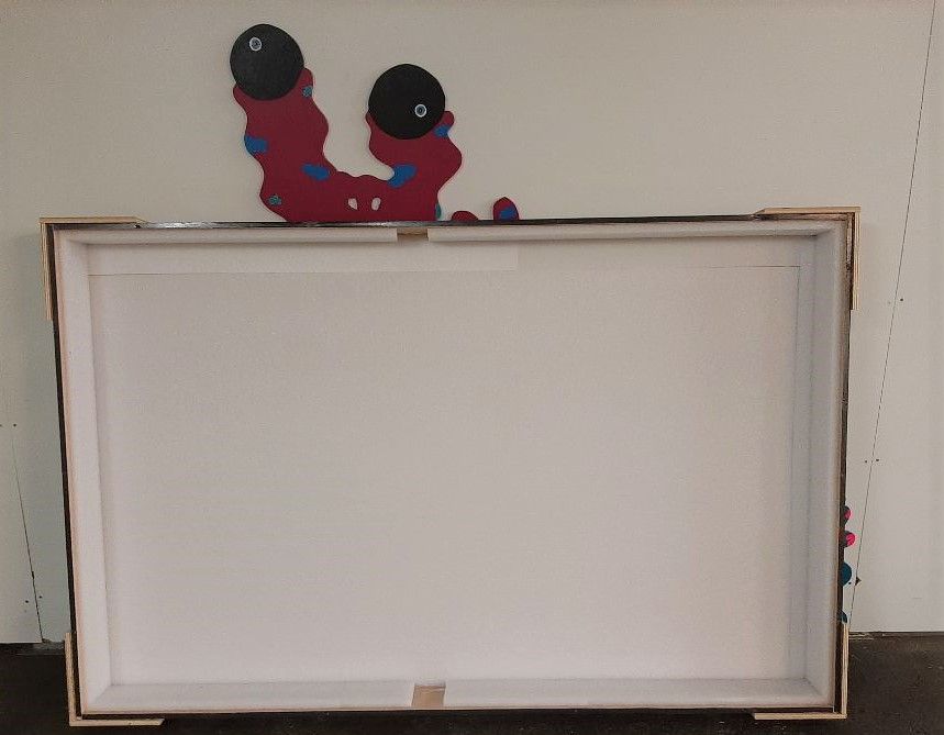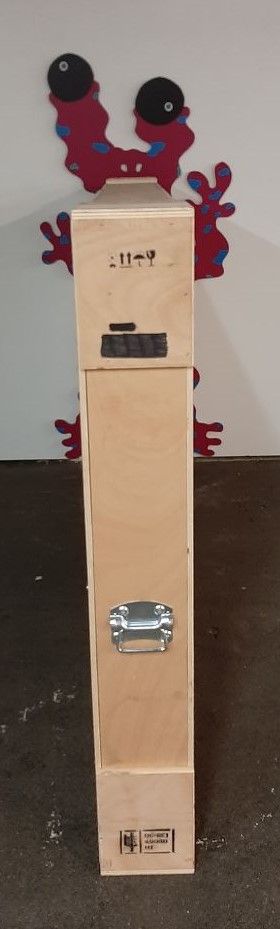 Wooden picture box, lined with Noppa, metal handles, outside 171x17x79cm, inside 164x14x91 measured without Noppa